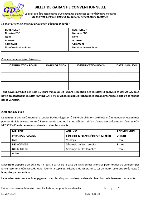 Il permet à l’acheteur d’avoir un recours si l’animal acheté présente un résultat non favorable aux analyses non obligatoires réalisées suite à une introduction. Ce document est à remplir par le vendeur ET par l’acheteur au moment de la transaction commerciale.