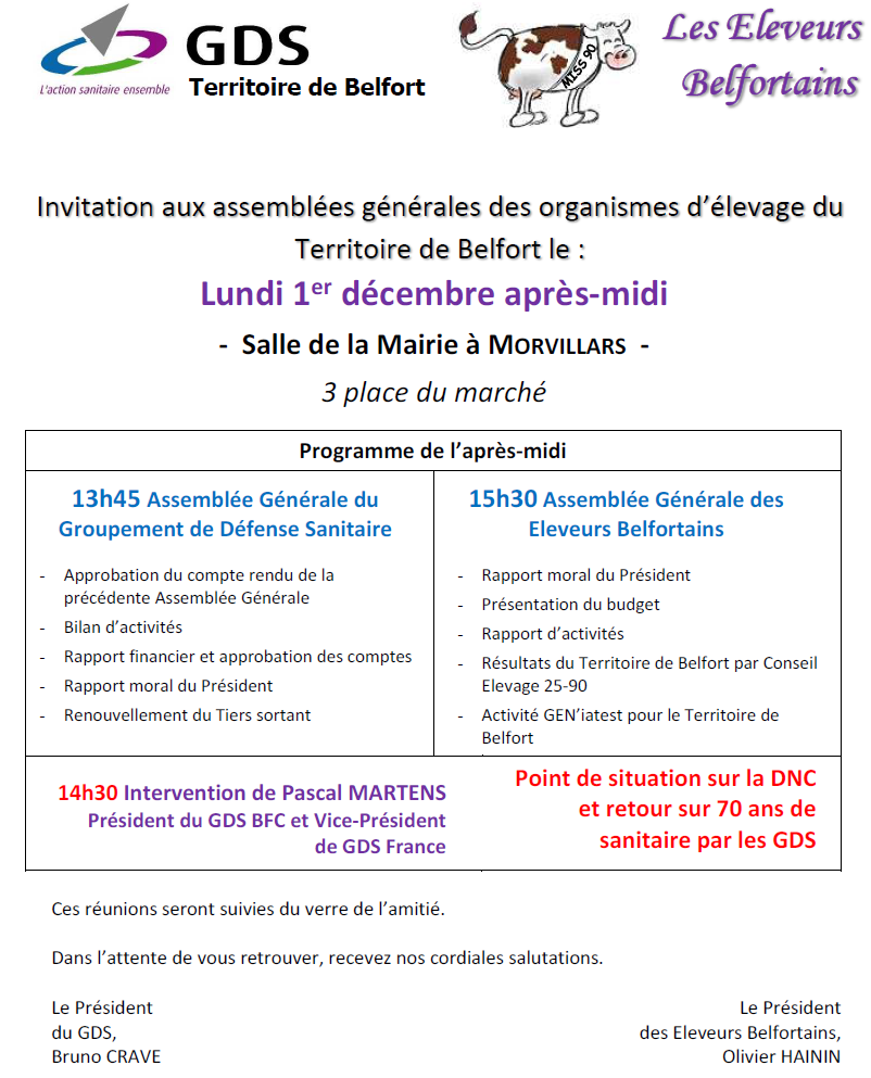L'Assemblée générale du GDS 90 se tiendra le 1er décembre après-midi à la salle de la Mairie de MORVILLARS. Comme chaque année ce rendez-vous est organisé en partenariat entre le GDS et les Eleveurs Belfortains.