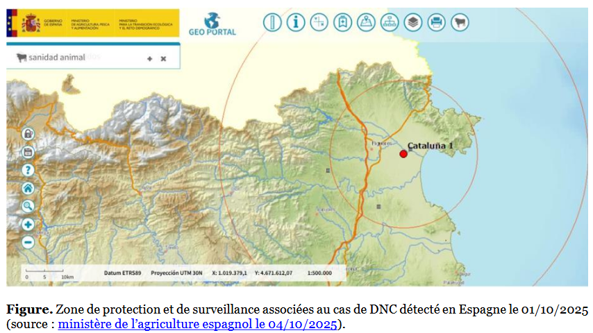 Trois bovins ont présenté le 01/10/2025 des signes cliniques compatibles avec la DNC (fièvre et nodules cutanés). Le LNR espagnol a confirmé l’infection par PCR sur ces trois animaux le 3/10/2025.