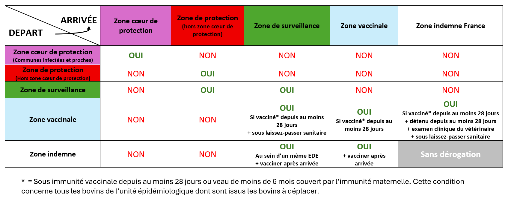 Le tableau des mouvements possibles est mis à jour, avec les conditions de sorties de zones des bovins quand nous serons passés en zone vaccinale :