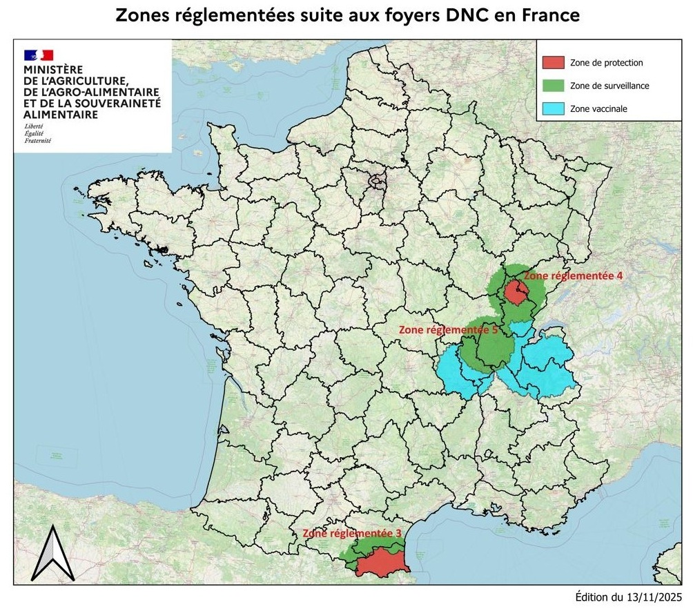 En date du 14 novembre 2025, 102 foyers ont été détectés en France, répartis dans six départements : Savoie (32), Haute-Savoie (44), Ain (3), Rhône (1), Jura (7) et Pyrénées-Orientales (15).