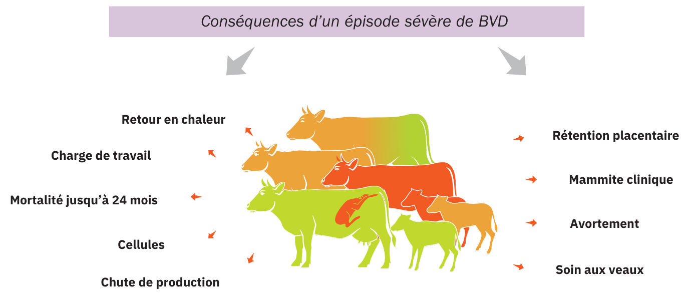 La BVD impacte tous les postes de production. Les pertes économiques sont scientifiquement évaluées en élevages infectés dans une fourchette de 46 € à 83 € par bovin et par an :