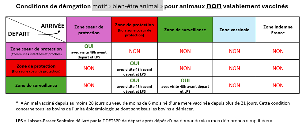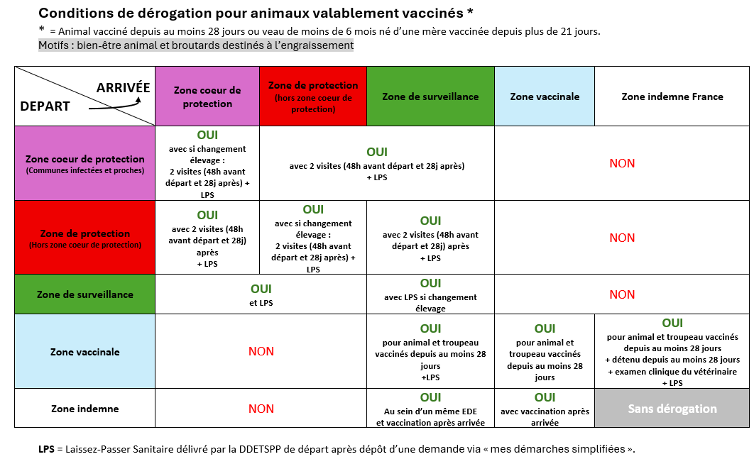 Quelques dérogations à l’interdiction de mouvements peuvent être autorisées au motif du bien-être animal (animaux blessés, vêlage, manque d'alimentation et d'abreuvement) et pour l’engraissement broutards.